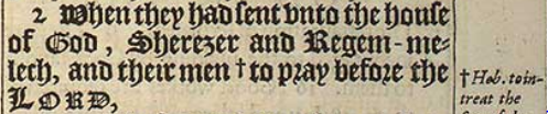 2 When they had sent vnto the house of God, Sherezer and Regem-melech, and their men +to pray before the Lord, [ +Heb. to intreat the face of the Lord. ]