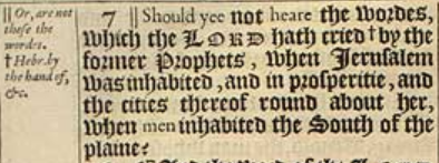 7 || Should yee not heare the wordes, which the LORD hath cried +by the former Prophets, when Ierusalem was inhabited, and in prosperitie, and the cities thereof round about her, when men inhabited the South of the plaine? [ || Or, are not these the wordes. , +Hebr. by the hand of, &c. ]
