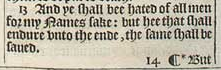 13 And ye shall bee hated of all men for my Names sake: but hee that shall endure vnto the ende, the same shall be saued.