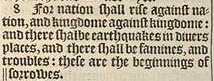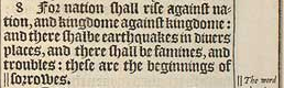 8 For nation shall rise against nation, and kingdome against kingdome: and there shalbe earthquakes in diuers places, and there shall be famines, and troubles: these are the beginnings of ||sorrowes. [||The word in the originall, importeth, the paines of a woman in trauaile.]