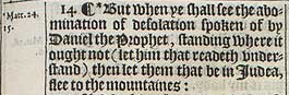 14 ¶ *But when ye shall see the abomination of desolation spoken of by Daniel the Prophet, standing where it ought not (let him that readeth vnderstand) then let them that be in Iudea, flee to the mountaines: [*Matt.24. 15.]