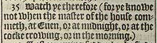 35 Watch ye therefore (for ye knowe not when the master of the house commeth, at Euen, or at midnight, or at the cocke crowing, or in the morning.)
