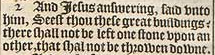 2 And Iesus answering, said vnto him, Seest thou these great buildings? there shall not be left one stone vpon an other, that shal not be throwen downe.