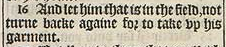 16 And let him that is in the field, not turne backe againe for to take vp his garment.