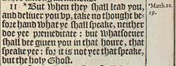 11 *But when they shall lead you, and deliuer you vp, take no thought before hand what ye shall speake, neither doe yee premeditate: but whatsoeuer shall bee giuen you in that houre, that speake yee: for it is not yee that speake, but the holy Ghost. [ *Matth.10. 19. ]
