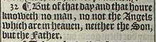 32 ¶ But of that day and that houre knoweth no man, no not the Angels which are in heauen, neither the Son, but the Father.