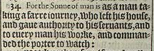 34 For the Sonne of man is as a man taking a farre iourney, who left his house, and gaue authority to his seruants, and to euery man his worke, and commanded the porter to watch: