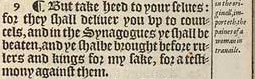 9 ¶ But take heed to your selues: for they shall deliuer you vp to councels, and in the Synagogues ye shall be beaten, and ye shalbe brought before rulers and kings for my sake, for a testimony against them.