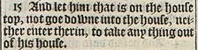 15 And let him that is on the house top, not goe downe into the house, neither enter therin, to take any thing out of his house.