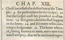 1 Christus sagt die Zerstörung des Tempels voraus: 9 Die Verfolgungen wegen des Evangeliums: 10 Dass das Evangelium allen Nationen gepredigt werden muss: 14 Dass den Juden großes Unglück widerfahren wird: 24 Und die Art seiner Ankunft zum Gericht: 32 Die Stunde davon, niemandem bekannt, soll jeder Mensch beobachten und beten, dass wir nicht unversehens angetroffen werden, wenn er zu jedem einzelnen kommt, insbesondere durch den Tod.