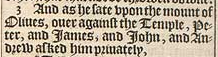 3 And as he sate vpon the mount of Oliues, ouer against the Temple, Peter, and Iames, and Iohn, and Andrew asked him priuately,