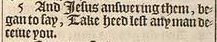 5 And Iesus answering them, began to say, Take heed lest any man deceiue you.