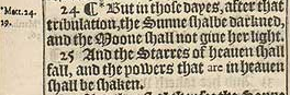 24 ¶ *But in those dayes, after that tribulation, the Sunne shalbe darkned, and the Moone shall not giue her light.[*Matt.24. 29.]