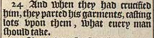 24 Und als sie ihn gekreuzigt hatten, teilten sie seine Kleidung, Lose auf sie werfend, was jeder Mann nehmen sollte.