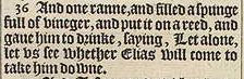 36 And one ranne, and filled a spunge full of vineger, and put it on a reed, and gaue him to drinke, saying, Let alone, let vs see whether Elias will come to take him downe.