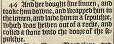 46 And hee bought fine linnen, and tooke him downe, and wrapped him in the linnen, and laide him in a sepulchre, which was hewen out of a rocke, and rolled a stone vnto the doore of the sepulchre.