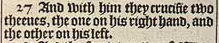 27 And with him they crucifie two theeues, the one on his right hand, and the other on his left.