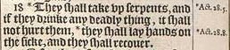 18 *They shall take vp serpents, and if they drinke any deadly thing, it shall not hurt them, *they shall lay hands on the sicke, and they shall recouer.[*Act. 28.5. , *Act. 28.8.]
