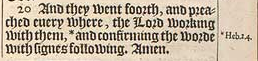 20 And they went foorth, and preached euery where, the Lord working with them, *and confirming the worde with signes following. Amen.[*Heb.2.4.]