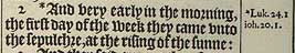 2 *And very early in the morning, the first day of the week they came vnto the sepulchre, at the rising of the sunne:[*Luk. 24. 1 ioh. 20. 1.]
