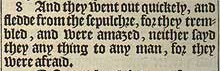 8 And they went out quickely, and fledde from the sepulchre, for they trembled, and were amazed, neither sayd they any thing to any man, for they were afraid.