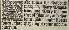 1 And when the Sabbath was past, Mary Magdalene, and Mary the mother of Iames, and Salome, had bought sweete spices, that they might come and anoint him.