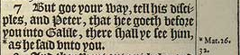 7 But goe your way, tell his disciples, and Peter, that hee goeth before you into Galile, there shall ye see him, *as he said vnto you.[*Mat.26. 32.]