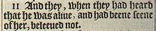 11 And they, when they had heard that he was aliue, and had beene seene of her, beleeued not.