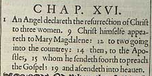 1 Ein Engel verkündet drei Frauen die Auferstehung von Christus. 9 Christus selbst erscheint Maria Magdalena: 12 Zweien, ins Land gehend: 14 Dann den Aposteln, 15 die er aussendet das Evangelium zu predigen: 19 Und steigt in den Himmel auf.