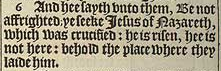6 And hee sayth vnto them, Be not affrighted; ye seeke Iesus of Nazareth, which was crucified: he is risen, hee is not here: behold the place where they laide him.