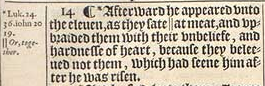 14 ¶ *Afterward he appeared vnto the eleuen, as they sate || at meat, and vpbraided them with their vnbeliefe, and hardnesse of heart, because they beleeued not them, which had seene him after he was risen.[*Luk. 24. 36. iohn 20 19. , ||Or, together.]
