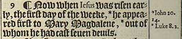 9 ¶ Now when Iesus was risen early, the first day of the weeke, *he appeared first to Mary Magdalene, *out of whom he had cast seuen deuils.[*Iohn 20. 14. , *Luke 8. 2.]