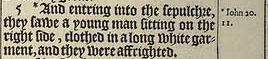 5 *And entring into the sepulchre, they sawe a young man sitting on the right side, clothed in a long white garment, and they were affrighted.[*Iohn 20. 11.]