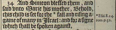34 And Simeon blessed them, and said vnto Marie his mother, Behold, this child is set for the *fall and rising againe of many in Israel: and for a signe which shall be spoken against,[*Esai. 8. 14. rom.9.32.]