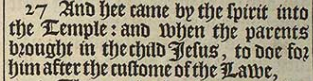 27 And hee came by the spirit into the Temple: and when the parents brought in the child Iesus, to doe for him after the custome of the Lawe,