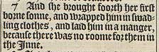 7 And she brought foorth her first borne sonne, and wrapped him in swadling clothes, and laid him in a manger, because there was no roome for them in the Inne.