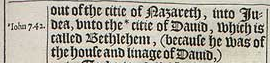 4 And Ioseph also wēt vp frō Galilee, out of the citie of Nazareth, into Iudea, vnto the *citie of Dauid, which is called Bethlehem, (because he was of the house and linage of Dauid,)[*Iohn 7.42.]