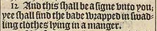 12 And this shall be a signe vnto you; yee shall find the babe wrapped in swadling clothes lying in a manger.