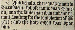 25 And behold, there was a man in Hierusalem, whose name was Simeon, and the same man was iust and deuout, waiting for the consolation of Israel: and the holy Ghost was vpon him.