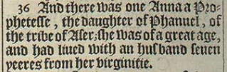 36 And there was one Anna a Prophetesse, the daughter of Phanuel, of the tribe of Aser; she was of a great age, and had liued with an husband seuen yeeres from her virginitie.