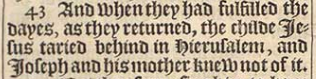 43 And when they had fulfilled the dayes, as they returned, the childe Iesus taried behind in Hierusalem, and Ioseph and his mother knew not of it.