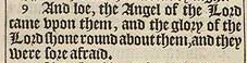 9 And loe, the Angel of the Lord came vpon them, and the glory of the Lord shone round about them, and they were sore afraid.