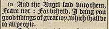 10 And the Angel said vnto them, Feare not: For behold, I bring you good tidings of great ioy, which shall be to all people.