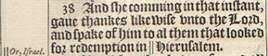 38 And she comming in that instant, gaue thankes likewise vnto the Lord, and spake of him to al them that looked for redemption in || Hierusalem.[|| Or, Israel.]