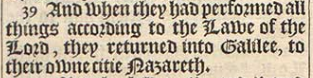39 And when they had performed all things according to the Lawe of the Lord, they returned into Galilee, to their owne citie Nazareth.