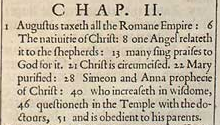 1 Augustus besteuert das ganze Römische Reich: 6 Die Geburt von Christus: 8 Ein Engel erzählt es den Hirten: 13 Viele preisen Gott dafür. 21 Christus wird beschnitten. 22 Maria gereinigt: 28 Simeon und Anna prophezeien über Christus: 40 Der an Weisheit zunimmt, 46 im Tempel mit den Lehrern debattiert, 51 und seinen Eltern gehorsam ist.