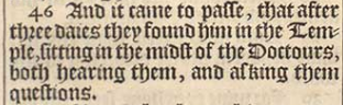 46 And it came to passe, that after three daies they found him in the Temple, sitting in the midst of the Doctours, both hearing them, and asking them questions.