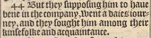 44 But they supposing him to haue bene in the company, went a daies iourney, and they sought him among their kinsefolke and acquaintance.
