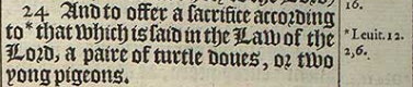 24 And to offer a sacrifice according to *that which is said in the Law of the Lord, a paire of turtle doues, or two yong pigeons. [ *Leuit.12. 2,6. ]