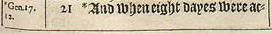21 *And when eight dayes were accomplished for the circumcising of the childe, his name was called *Iesus, which was so named of the Angel before he was conceiued in the wombe.[*Gen.17. 12. , *Mat.1. 21.]
